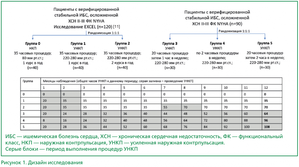 Для изучения эффектов различных режимов терапии УНКП использовались данные пациентов из открытого рандомизированного исследования EXCEL (Long-term Effects of enhanced eXternal CountErpuLsation; NCT05913778) [11]. Дополнительно в исследование в 2017-2018 гг. включены 90 пациентов со стабильной ИБС, осложненной ХСН, с аналогичными критериями включения и исключения, которые были рандомизированы в три группы с различными режимами терапии УНКП.