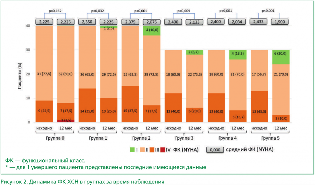 В группе 0 зарегистрирован 1 (2,5%) случай смерти на 11-м мес. наблюдения (использовались последние полученные данные). Все остальные пациенты завершили исследование. Максимально часто неблагоприятные исходы регистрировались в группе 0, частота которых была значимо больше таковых в остальных группах. В группе 5 отмечен только один случай госпитализации по поводу ХСН, остальные неблагоприятные исходы не отмечались.