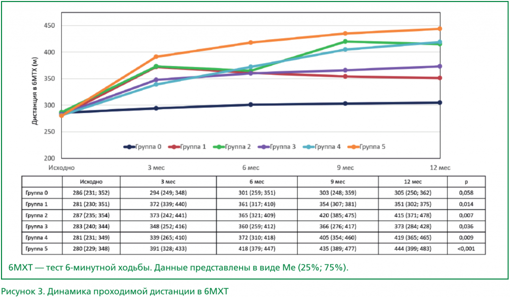 За время наблюдения (12 месяцев) значимой динамика среднего ФК ХСН оказалась только в группах 1-5, но не в группе 0 (см. рис. 2). Схожие изменения были отмечены и при оценке толерантности к физической нагрузке. Увеличение дистанции ходьбы по данным 6МХТ выявлено во всех группах, однако значимой динамика оказалась только в группах 1 (на 24,9%), 2 (на 44,5%), 3 (на 31,8%), 4 (на 49,1%) и 5 (на 58,6%), но не в группе 0 (на 6,6%) (рис. 3). При этом доля пациентов с увеличением дистанции в 6МХТ >20% через 12 мес. составила соответственно 72,5%, 97,5%, 76,7%, 90%, 100% и 7,7%.