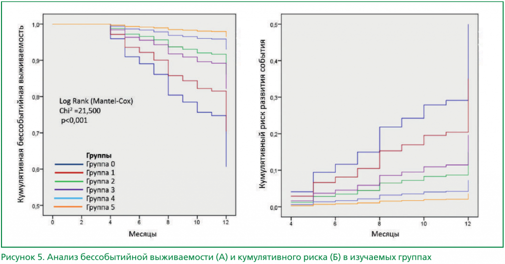 При применении лог-рангового теста показано, что кумулятивная выживаемость в группах 2, 4 и 5 была значимо выше таковой в остальных группах, и, соответственно, кумулятивный риск развития событий в группах 2, 4 и 5 был минимальным (рис. 5).